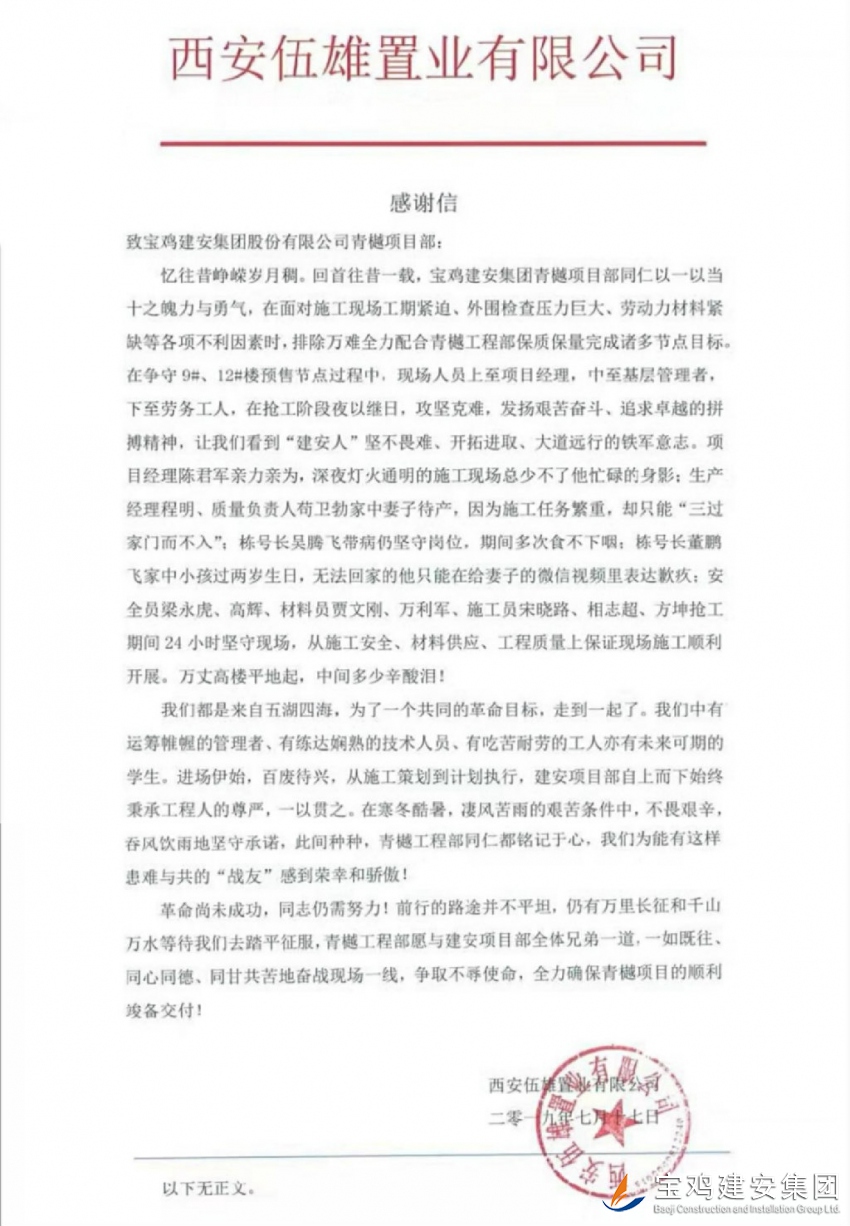 2019年7月17日,我公司路橋項目部承建的中南青樾項目收到由建設(shè)單位西安伍雄置業(yè)有限公司發(fā)出的一封感謝信,信中言辭懇切,對路橋公司青樾項目管理人員給出了極高的評價。在面對施工現(xiàn)場工期緊迫、資金短缺、外圍檢查壓力巨大、勞動力材料緊缺等各項不利因素時,寶雞建安集團(tuán)青樾項目部各位同仁克服自身困難、艱苦奮斗、不畏艱難以一當(dāng)十之魄力與勇氣保質(zhì)保量并按工期節(jié)點完成了施工任務(wù)。