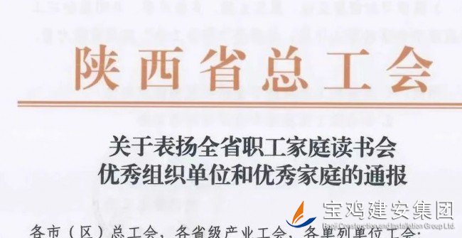另據(jù)消息,在第28個“世界讀書日”到來之際,由市總工會推薦的全市職工讀書活動兩個代表家庭,被陜西省總工會授予全省優(yōu)秀單位稱號,寶雞建安集團(tuán)工會成為代表全市職工讀書活動中的典型表率之一,受到全省通報嘉獎,為寶雞贏得了榮譽。