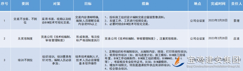 浦賽紅從“5M1E”原因類別入手,即人員、機(jī)器、材料、方法、環(huán)境、測(cè)量,收集各種信息、數(shù)據(jù)資料,對(duì)分析出來(lái)的所有末端原因到現(xiàn)場(chǎng)進(jìn)行測(cè)量、試驗(yàn)、調(diào)查分析,找出主要原因,整理分析得出正確結(jié)論,制定滅蚊措施。利用科學(xué)的統(tǒng)計(jì)方法,浦賽紅把這最微不足道的小事,做到了極致,成了“專家”。由此看來(lái),人類從最開(kāi)始面對(duì)事物到逐步認(rèn)識(shí)世界和改造世界的過(guò)程中,統(tǒng)計(jì)方法起到了重大作用。 在科學(xué)技術(shù)高速發(fā)展的今天,統(tǒng)計(jì)方法在潛移默化中得到了日益廣泛和深入的應(yīng)用。技術(shù)管理過(guò)程中應(yīng)用科學(xué)的統(tǒng)計(jì)方法排列圖法,提高投標(biāo)施工組織設(shè)計(jì)審核合格率。見(jiàn)下圖:通過(guò)整理近年全公司投標(biāo)施工組織設(shè)計(jì)編寫(xiě)情況,對(duì)投標(biāo)施工組織設(shè)計(jì)審核結(jié)論進(jìn)行分析、統(tǒng)計(jì)、總結(jié)。根據(jù)排列圖分析,影響標(biāo)書(shū)審核得分的關(guān)鍵因素是“投標(biāo)施工組織設(shè)計(jì)內(nèi)容針對(duì)性不強(qiáng)”,“項(xiàng)目部、分公司投標(biāo)負(fù)責(zé)人或組織人員缺乏系統(tǒng)性部署”其累計(jì)頻率已達(dá)到77.77%,是主要解決的問(wèn)題。經(jīng)過(guò)討論、分析,按照PDCA原則,最后制定了相應(yīng)實(shí)施對(duì)策與措施,落實(shí)責(zé)任人和完成時(shí)間,對(duì)策表見(jiàn)下圖:學(xué)習(xí)永無(wú)止境,在技術(shù)管理方面要不斷掌握和應(yīng)用更多的統(tǒng)計(jì)方法,這樣就有利于更好地解決技術(shù)問(wèn)題。除此之外,端正工作態(tài)度,提高自身業(yè)務(wù)水平。立足平凡崗位,從點(diǎn)點(diǎn)滴滴日常工作小事做起,腳踏實(shí)地,改變思維,創(chuàng)新工作。從而做到知己知彼,百戰(zhàn)不殆。